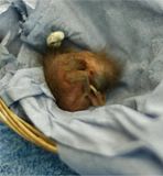 We had our first baby squirrels from the second broods in today. They were only about two weeks old, so their eyes are still closed and they are just starting to grow fur. Someone cut down their tree.